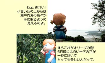 やってきました日本のエーゲ海、牛窓。なるほど瀬戸内海を見下ろす小高い丘にはオリーブの樹がいっぱい。気持ちいい潮風が頬をなでてリゾート気分を大満喫よ!