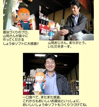 ひとつめのご当地ソフト、しょう油ソフトクリームを販売する鷹取醤油さんも創業100年を超える老舗のお醤油屋さん。お醤油を知り尽くしたプロがバニラとの相性の良さに注目してつくり出したのが、その名もしょうゆソフトというわけなのよ!ああ、早く食べたいよ〜。