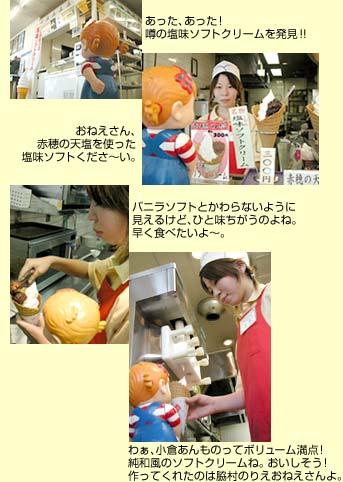 赤穂の銘菓、塩味まんじゅうのおいしさを何とかソフトクリームにできないものかと考え出されたのがこの塩味ソフト。もちろん赤穂産の天塩を使用し、季節によってその量も微妙に調整するというほどに手のこんだご当地ソフト。きわめつけはソフトの脇に添えられた小倉あんである。ソフトの合間にあんを食べることによってほのかな塩の風味と上品なソフトの甘みのいずれもが際立つ仕掛けとなっている。今年の4月からの販売ながらレギュラーのバニラを抑えて堂々の売上ベスト1商品。その人気は今後もさらに高まりそうである。