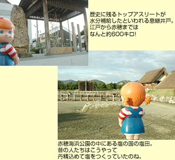 赤穂海浜公園は瀬戸内海に面した楽しい施設よ。遊園地はじめオートキャンプ場や潮干狩り場もあって家族みんなで遊べるの。そして、忘れてはいけないのが、公園内の潮の国。昔ながらの赤穂の塩づくりのようすを実際に見ることができるのよ。