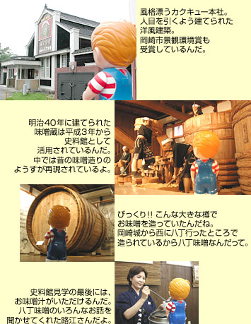 さて、三河のご当地ソフト第一弾は八丁味噌で全国的に知られるカクキュー本社の直営売店で味わうことのできる八丁味噌ソフト。カクキューといえば、始祖・久右ヱ門勝久が江戸時代初期に味噌の仕込みを始めたのが八丁味噌の起こりといわれるほど由緒ある会社。本社事務所や蔵は、国の登録文化財に指定されているんだよ。