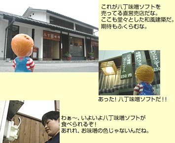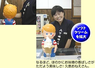水と塩と大豆だけを原料に二夏二冬、24ヶ月の歳月をかけて天然熟成させた八丁味噌。今日ではわずか2社となった製造メーカーの一方の雄、カクキューが誇る八丁味噌を練り込んだユニークなソフトクリームである。味噌の風味がかすかに漂うものの後味は一般的なバニラソフトよりもあっさりしている。上質の味噌ならではの香ばしい香りが全体の味わいを引き締め、初めて口にするのに、どこか懐かしい味わいは、日本人の舌に馴染みの深い大豆食文化のもたらすものか。売店ではこの他にも味噌を用いたカステラなども販売されているが、いずれも口にするとノスタルジックな味わいが広がる。