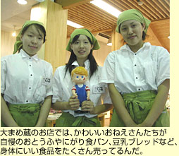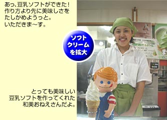 「大まめ蔵」とは、“うまい、安全、安心”を謳い、とことんこだわった豆腐やそれを材料とする惣菜、豆乳ブレッド、さらにはJAとのタイアップによって地元でとれた野菜も販売するという、健康をコンセプトにしたユニークな店舗である。そのこだわりは当然、この豆乳ソフトにも生きている。口にした瞬間、昔ながらのコクのあるうまい豆腐を食べた時のゆたかな風味が広がる。いわゆる大豆の味だが、その滋味が通り過ぎると、今度は実にさっぱりとした後味が口中を満たす。このコントラストこそが豆乳ソフトの美味さといえよう。大まめ蔵の豆腐を食べ慣れた子どもたちにも人気の、地域に根ざしたご当地ソフトである。