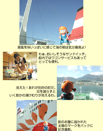 船の中にはレストランやゲームコーナー、展望風呂もあるのよ。客室をまわるワゴンサービスでおいしいサンドイッチを買って朝食に。おだやかな海を眺めながらいただきま〜す。
