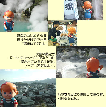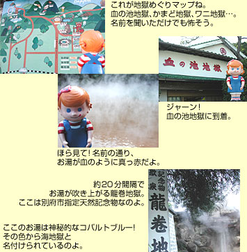 別府といえば温泉。その中でも鉄輪・亀川温泉一帯は“地獄めぐり”で全国的に有名。千年以上も昔から噴気や熱泥、熱湯が吹き上がり、人々から恐れられていたけれど、今は別府には欠かせない観光スポット。さっそく、わたしもこの世の地獄を見てまわろうっと。
