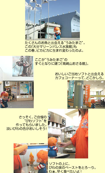 “うみたまご”の愛称で親しまれる人気の「大分マリーンパレス水族館」のおとなりに、この春オープンした「高崎山おさる館」。このパビリオンの1階にあるカフェコーナーで、ひとつめのご当地ソフト “びわソフト”と“海じおソフト”が食べられるのよ。とっても楽しみ!