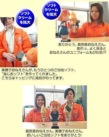 眼前に広がる別府湾の海原をイメージしたという「海じおソフト」。一口めには塩の味をかすかに感じるものの、食べるに従い、甘みが際立ち、海じおが絶妙な隠し味となっている。ユニークな海苔のトッピングがベースのバニラの濃厚な風味を和らげ、すっきりとした味わいを生みだしている。「びわソフト」は女性客、「海じおソフト」が男性客に人気というのも大いにうなずける。