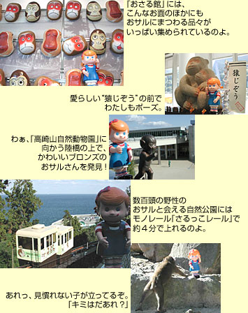 「高崎山おさる館」でいろんな情報を学んだあとは、モノレールに乗って、ほんもののおサルさんに会いに行くわよ。高崎山自然動物園のおサルさんたちは仲良くしてくれるかしら。