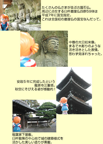 大分市のおとなり臼杵市は、多くの歴史遺産の残る海沿いの町。その中でも、全国的に有名な国宝臼杵石仏へ。周辺ののどかな風景を楽しみながら石仏群を見学。来春には当地を舞台にした映画も公開予定で、臼杵の町はいよいよ脚光を浴びること間違いなし。ひと足先に観光できて大満足!