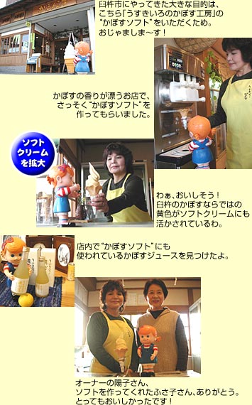 かぼすは一般的にはグリーンが主であるが、原産地である臼杵のかぼすは南国の太陽をいっぱいに受けて黄色く熟す。その“うすき色のかぼす”を絞った原液を加えて作られるのが「かぼすソフト」。かぼすは香酸柑橘の一種で、クエン酸はレモンの倍、ビタミンCもゆずやすだちよりも豊富に含まれているという。いわば「かぼすソフト」は、そのかぼすの爽やかな香りと風味を凝縮した自慢のソフトである。想像通り、ベタついた甘みはなく、すっきりとした味わい。かぼすジュースの成分が細かい粒状となって舌の上に広がるのも爽快感を演出する。まさに南国ならすっきりとした大人のご当地ソフトである。