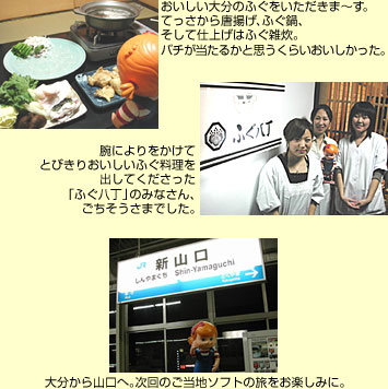 今回の旅のしめくくりは、ふぐ料理よ。ふぐといえば下関が有名だけど大分の近海で獲れるふぐも負けず劣らず上質で、わざわざ神戸や大阪から食べに訪れる人も多いとか。さて、ご当地自慢のふぐ鍋をたっぷりとご賞味させていただきま〜す。