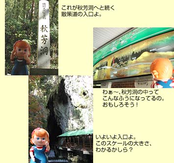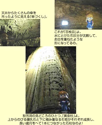 やって来ました東洋一の大鍾乳洞「秋芳洞」。ここは大正15年、昭和天皇が皇太子の時に洞内を探勝されて「秋芳洞」と名付けられたんですって。カルスト台地で有名な秋吉台の地下100メートルに広がる鍾乳洞で、洞内の観光コースは約1キロも続くのよ。