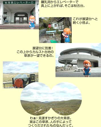エレベーターの出口から歩いて5分で秋吉台展望台よ! このひろ〜いカルスト台地が約3億5千万年前はサンゴ礁だったって知ってた?
