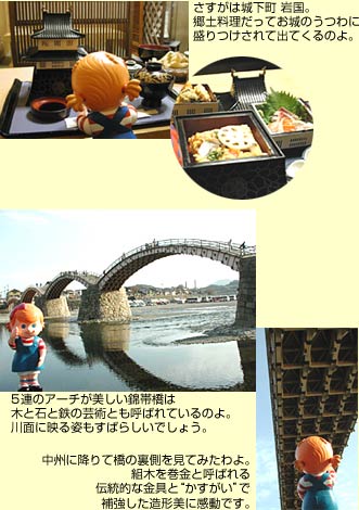 いよいよ錦帯橋よ。この橋は1673年、第三代岩国藩主 吉川広嘉によって創建されたんだって。ところが昭和25年には下を流れる錦川の増水で流出。昭和28年に再建され、平成13年からは「平成の架け替え」が行われ、平成16年3月に生まれ変わったばかりなのよ。