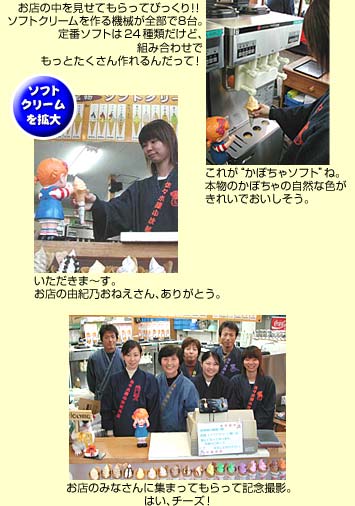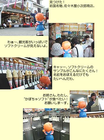 錦帯橋を渡ってちょっと歩くと、あった!今回の旅のふたつめのお目当て、佐々木屋小次郎商店。山口では超有名、錦帯橋を訪れた人ならきっと覚えている日本一の品ぞろえのソフトクリーム屋さんよ!今日は大人気の“かぼちゃソフト”をいただきま〜す。