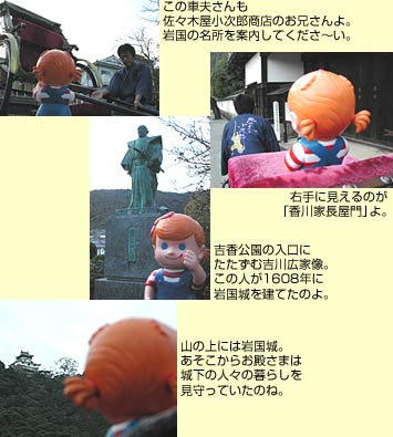 佐々木屋小次郎商店では、人力車による観光案内もやっているのよ。わたしもさっそく人力車に乗って吉香公園から香川家長屋門、佐々木小次郎像をめぐるコースに出発!