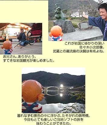 時間も忘れて名所めぐりを楽しんでいたら、すっかり日も暮れて錦帯橋もライトアップされていました。川面にうつるきれいなアーチを見つめながら、そろそろ岩国ともお別れね。今回の山口県の旅もステキな体験とおいしいご当地ソフトが楽しめたすばらしい旅だったわ。山口のみなさん、ありがとう。