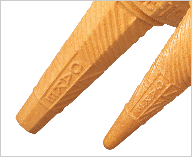 日世コーンの一つ、「No.1フレアートップコーン」の下部に「CAKE」の文字が綴られているのをご存知でしょうか?「No.1フレアートップコーン」のような軽い食感のタイプのコーンはケーキコーン(CAKE CONE)と呼ばれており、『CAKE』の文字をデザインしております。『CAKE CONE』というのは、『円錐形のお菓子』という意味です。